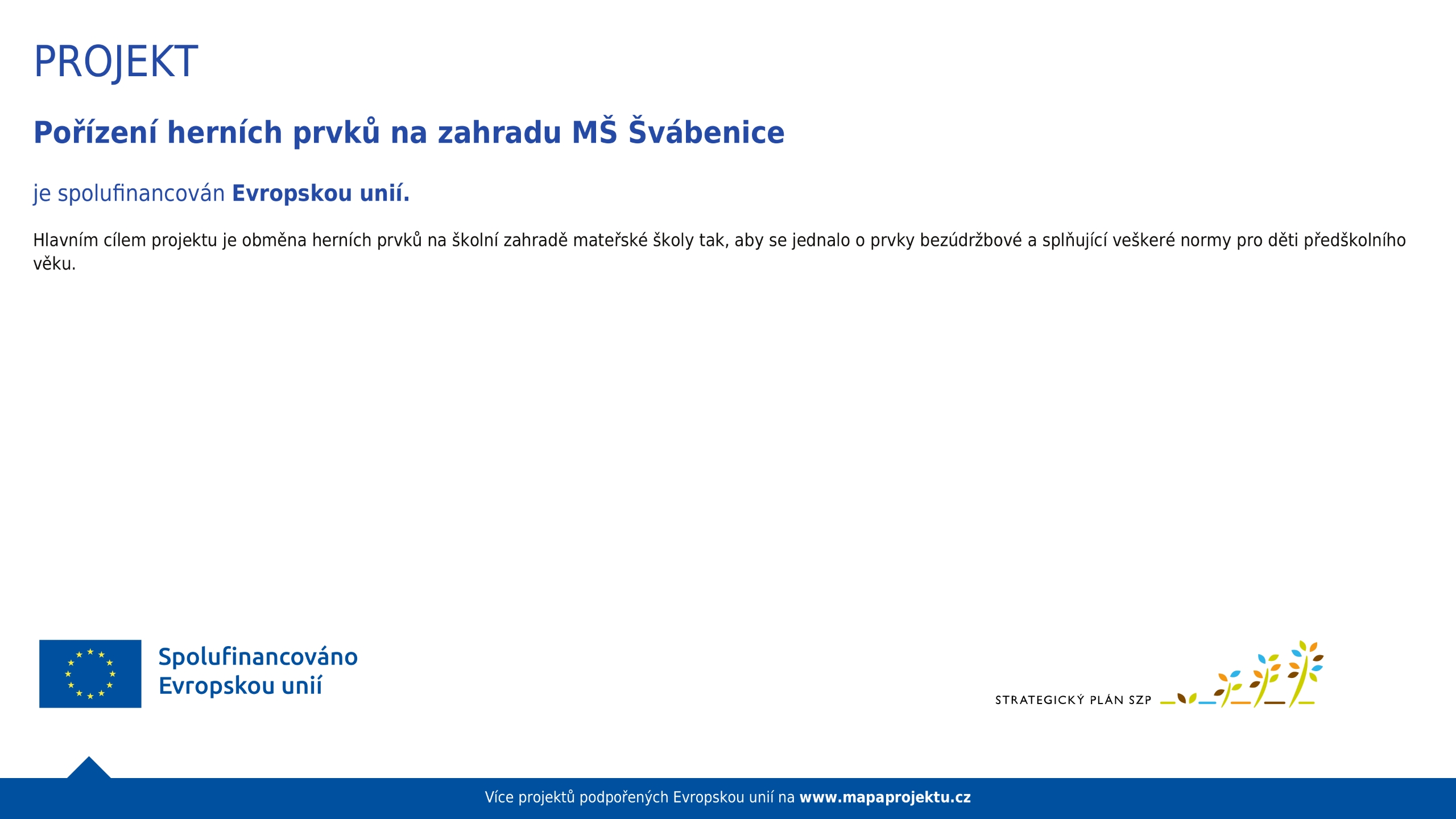 Projekt „Pořízení herních prvků na zahradu MŠ Švábenice“ – projekt je spolufinancován Evropskou unií. Hlavním cílem projektu je obměna herních prvků na školní zahradě mateřské školy tak, aby se jednalo o prvky bezúdržbové a splňující veškeré normy pro děti předškolního věku. Projekt je realizován v první polovině kalendářního roku 2025.